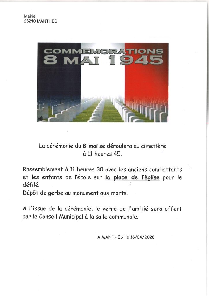 À l’issue de la cérémonie, le verre de l’amitié sera offert par le Conseil Municipal à la salle communale.