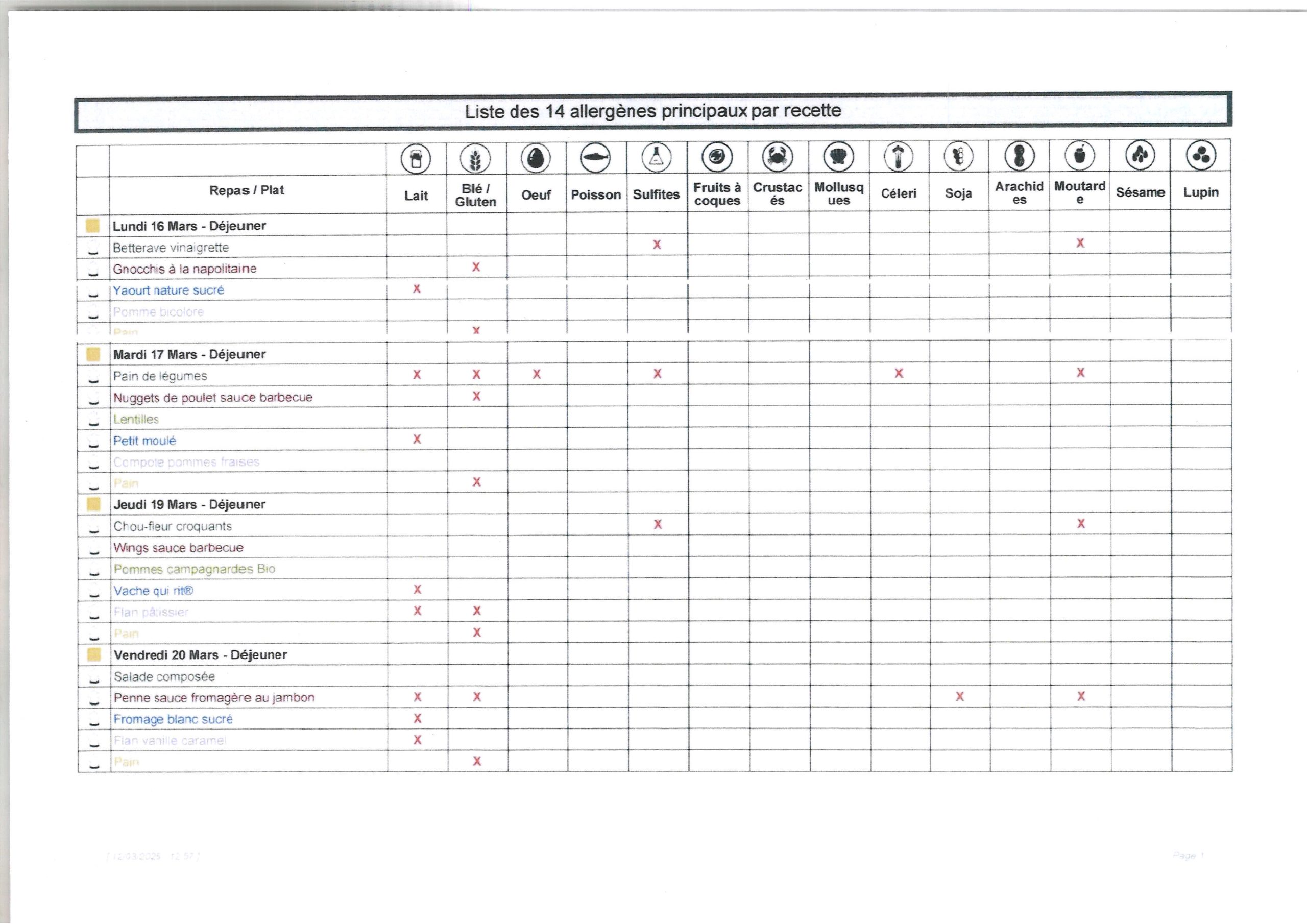 Liste des allergènes principaux par recette (16 au 20 mars 2026):