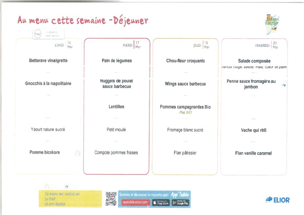 Menus du lundi 16 mars au vendredi 20 mars 2026: