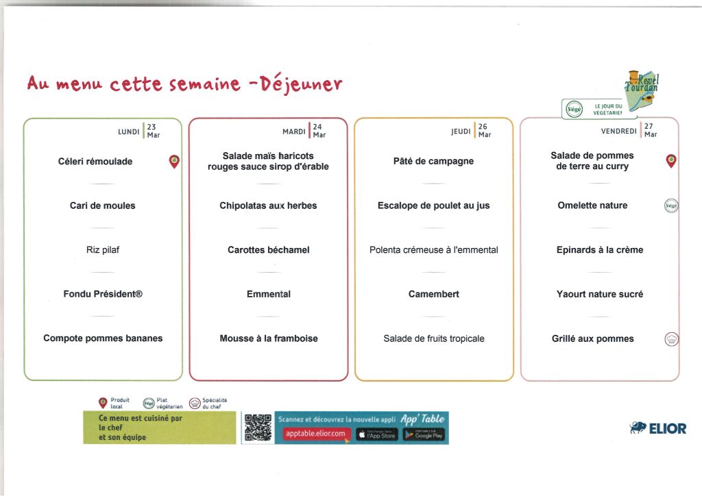 Menus du lundi 23 mars au vendredi 27 mars 2026: