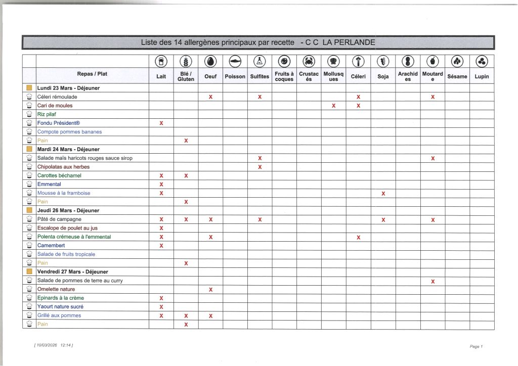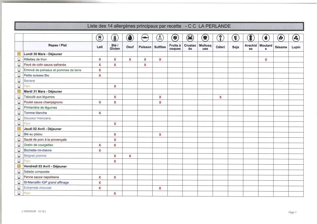 Liste des allergènes principaux par recette (30 mars au 03 avril 2026):