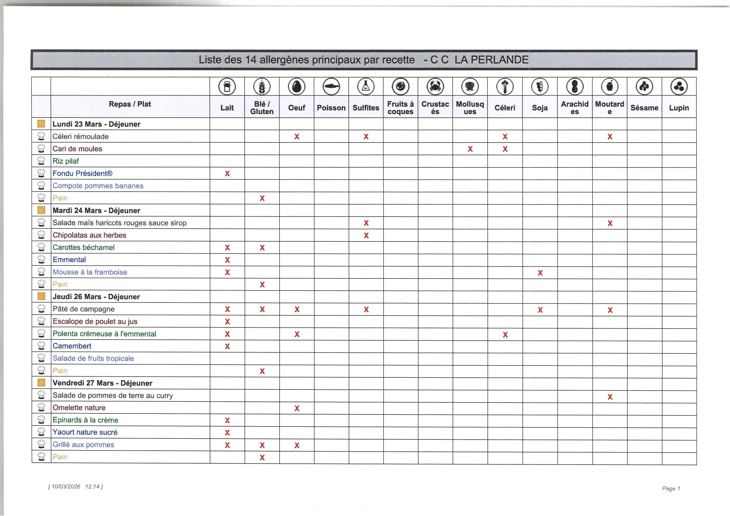 Liste des allergènes principaux par recette (23 au 27 mars 2026):