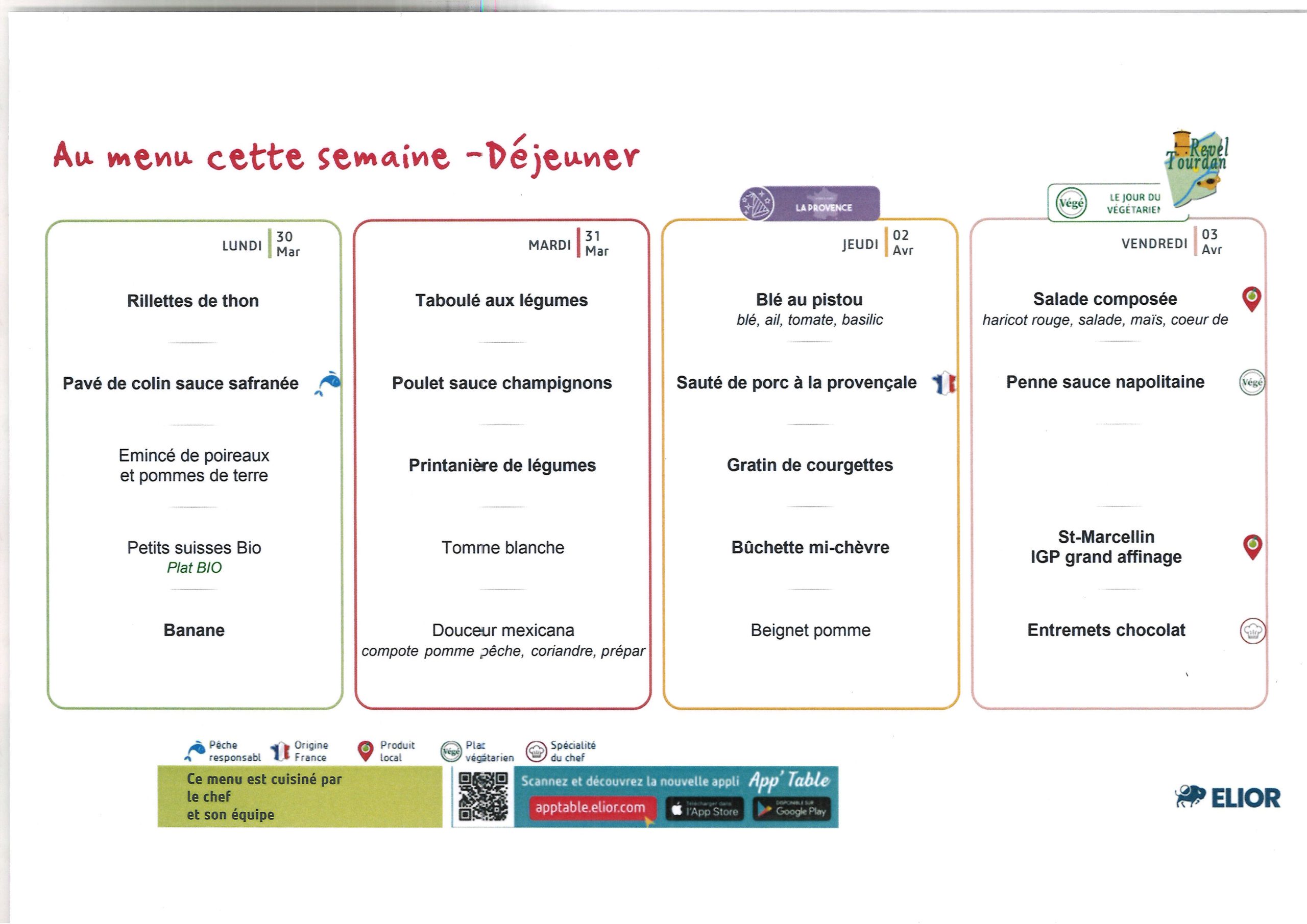 Menus du lundi 30 mars au vendredi 03 avril 2026: