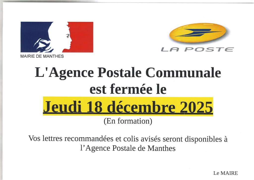 L’Agence Postale Communale est fermée le jeudi 18 décembre 2025