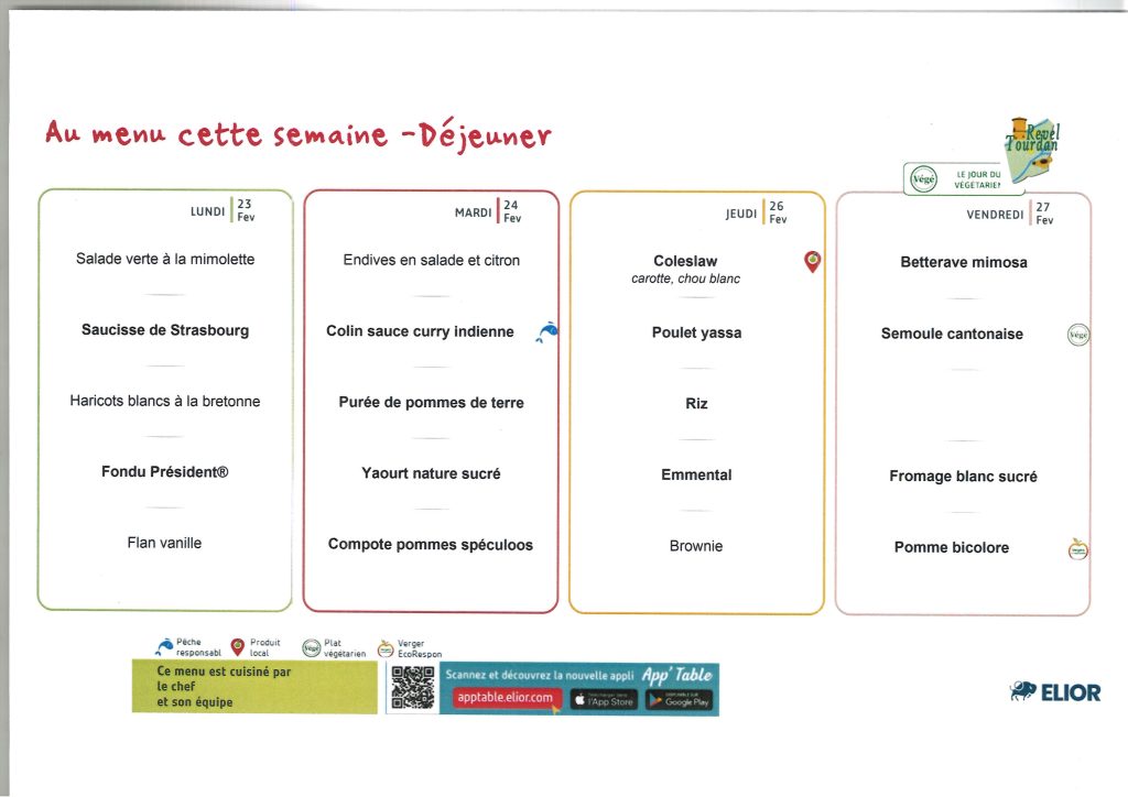 Menus du lundi 23 février au vendredi 27 février 2026: