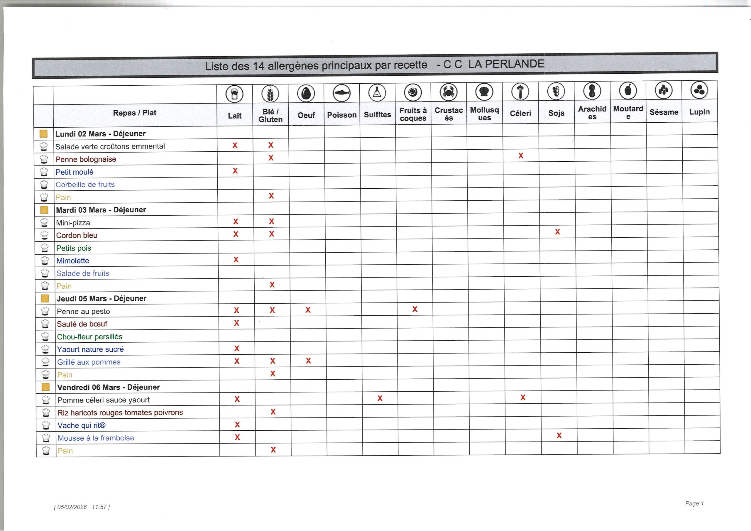 Liste des allergènes principaux par recette (02 au 06 mars 2026):