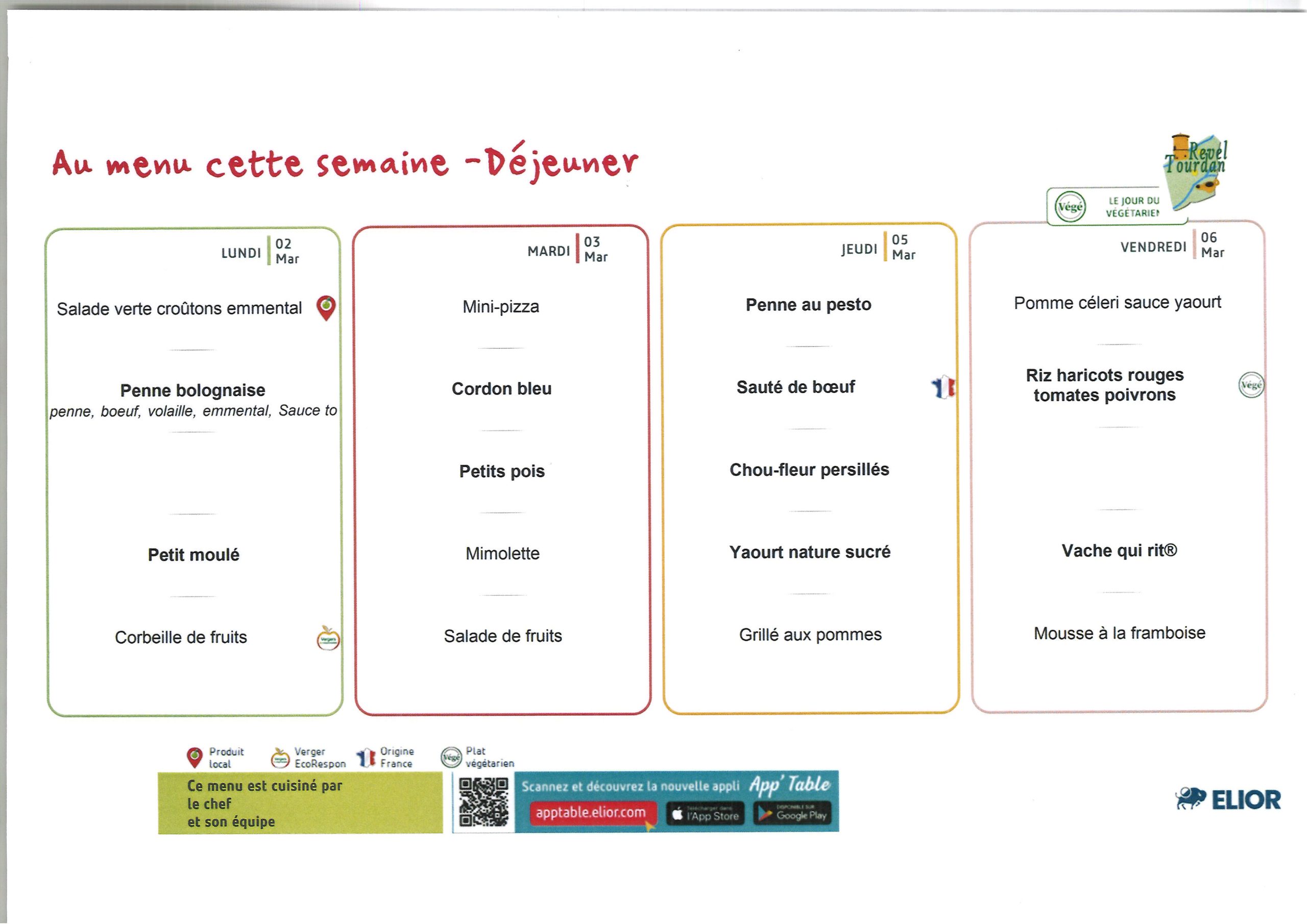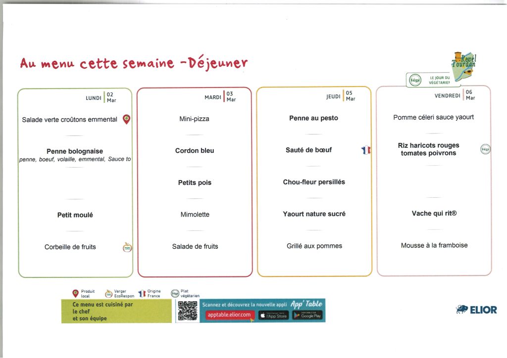 Menus du lundi 02 mars au vendredi 06 mars 2026:
