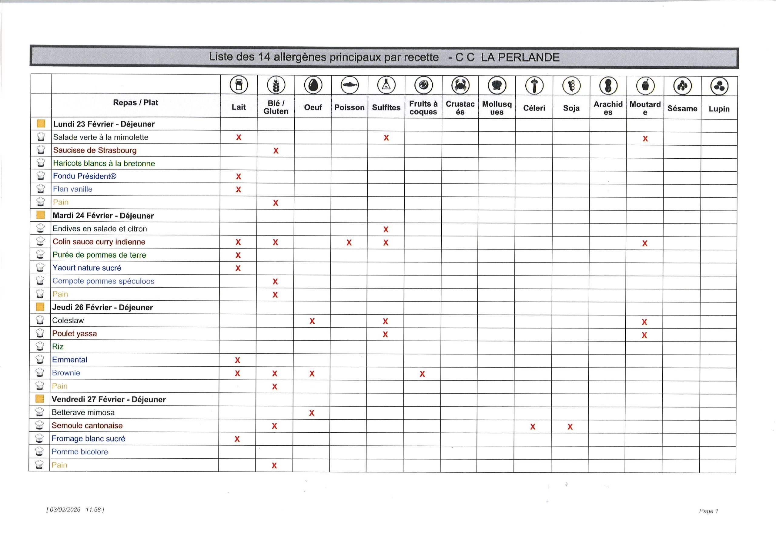 Liste des allergènes principaux par recette (23 au 27 février 2026):